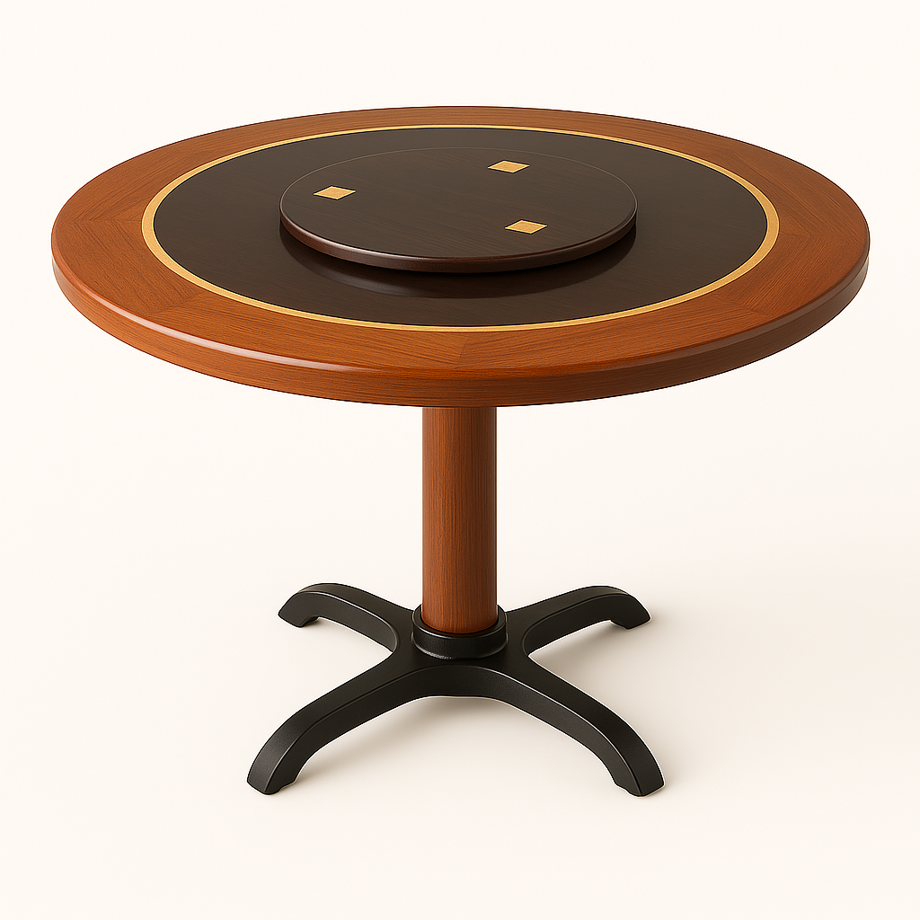 La Mesa Giratoria Chifa Imperial combina elegancia y funcionalidad para restaurantes de estilo oriental. Su tablero de doble tono presenta un anillo giratorio de madera marrón oscuro con delicados detalles dorados, facilitando el servicio colectivo. La estructura cuenta con una sólida pierna central de madera maciza y una base de metal negro que aporta estabilidad y resistencia frente al uso intensivo.